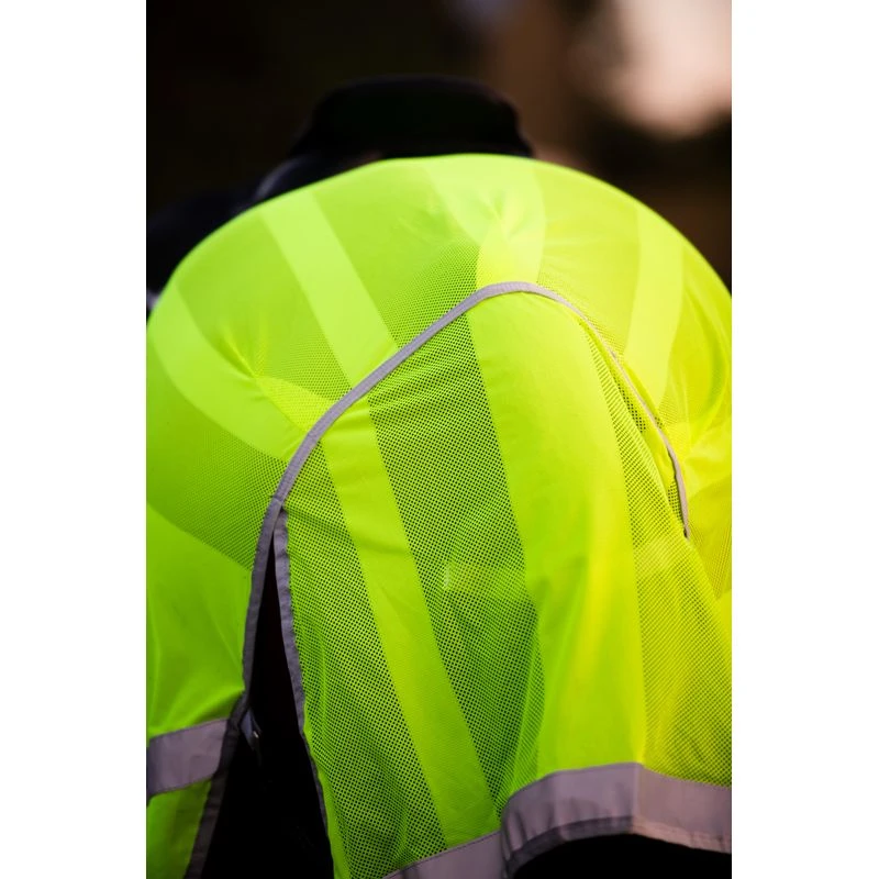 Protect your horse from flies while you ride! This unique design features lightweight and soft skrim polyester fabric with easy to secure Velcro closures. The contoured body shape fits around the saddle and allows room for the riders leg. A detachable easy-open large hood will protect the neck and shoulders, a loop attaches to the bridle to keep the Flyrider in place, and reflective safety strips offer added safety.