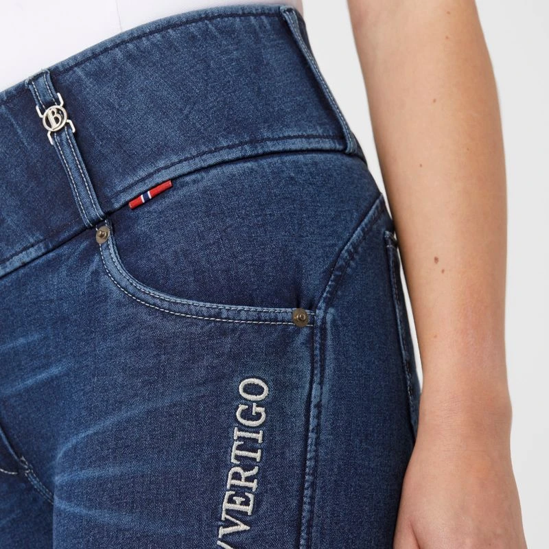 The B Vertigo Dianne breeches are made from soft, water and dirt repellent denim material. The high waist keeps them in place, and the silicone full seat keeps you in the saddle. Belt loops, 3 button closure and contrasting seams around pockets and belt loops add to the typical jeans look. Breathable fabric keeps you cool while riding or in the stables. Subtle B Vertigo embroidery adds a chic detail.