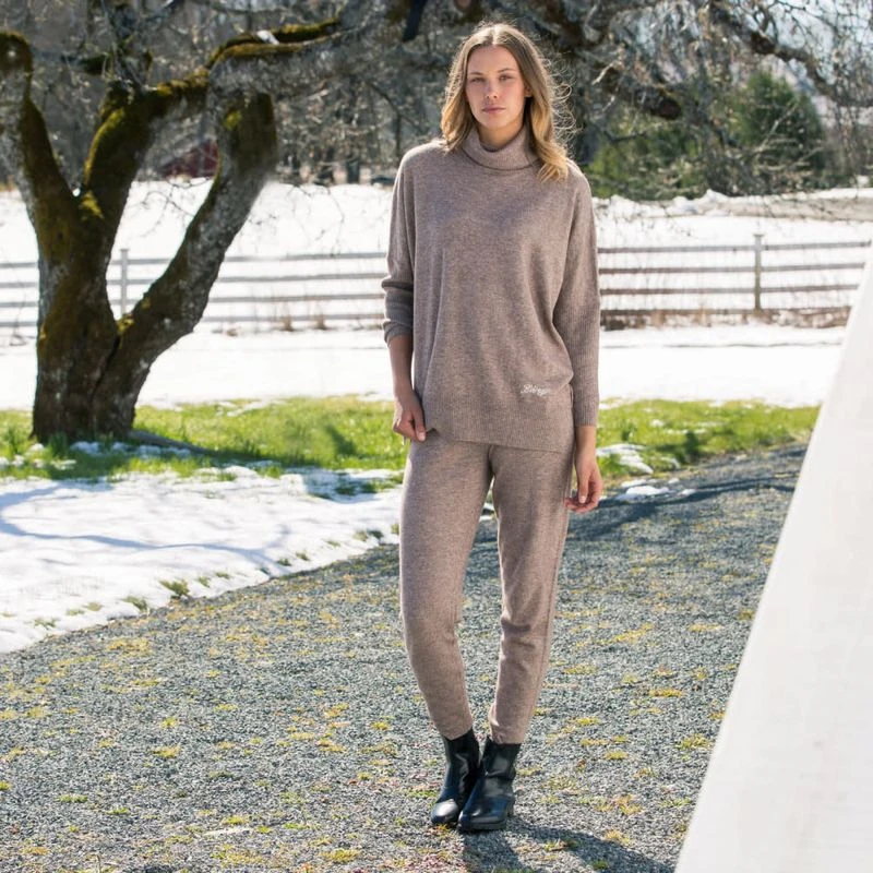 This set features a high-neck sweater and matching drawstring pants. The cozy and luxurious wool and cashmere blend provides ultimate comfort and warmth during cold winter evenings. The relaxed fit and quality of fabric are sure to make this a winter favorite.