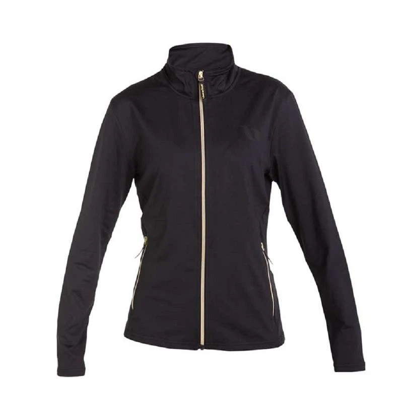 The Athena Performance Sweater is made from exclusive lightweight fabric containing Back on Trackiontextechnology. This zip up is made of a soft, lightweight and quick dry material that is perfect for training or lounging. The Back on Track iontex innovation textile is infused with minerals to create infrared energy and thermal regulation.The lightweight Athena has a tailored fit with extraordinary details in gold tones for an elegant but sporty look. The anatomically shaped collar with zip guard is designed for extra comfort and to prevent chaffing. This look is completed with front zip pockets and the Back on Track logo. Features include infrared energy, thermal regulation,quick dry,anti-bacterial, and odor control.