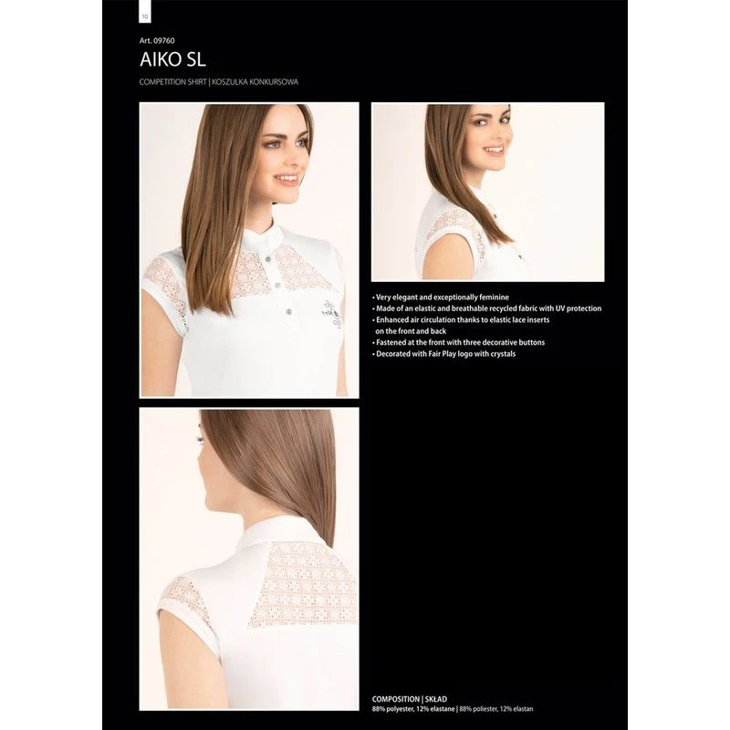 The Aiko is made of a stretchy and breathable recycled fabric with UV protection. The lace inserts on the front and back look great and add enhanced air circulation. The tab collar is fastened at the front with three decorative buttons.