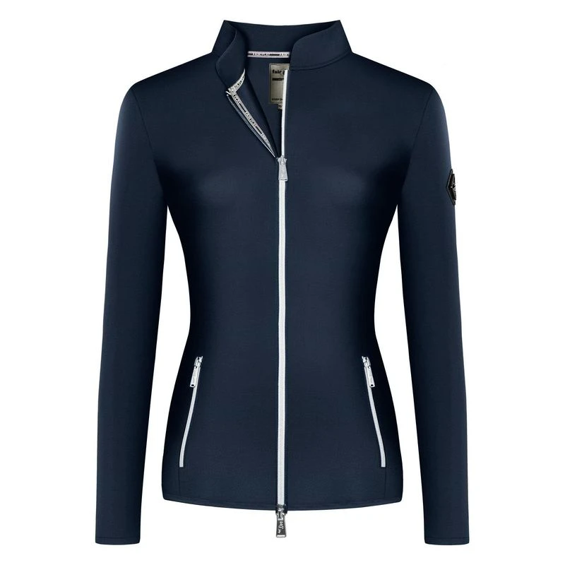 This two way stretch light jacket has a stand up collar and traditional track suit look. It has a feminine, close fitting shape and two way zipper for ease in the saddle. There are two spacious zip pockets and a metal Fair Play logo on the sleeve.
