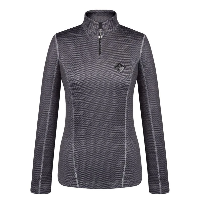 This 1/4 zip tech shirt is made of a soft warm fabric with a brushed interior. It has a decorative zip pull, tab collar, and fitted seaming. The Herringbone type patterm on the fabric adds a touch of style to this practical winter tech shirt.