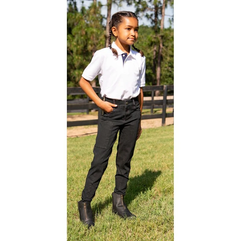 This breech is made from 4-way stretch denim in an onyx color with contrast lavender stitching. The printed FITS knee patch tread pattern is not just a pretty series of dots, it provides directional friction to give your young rider the grip right where they need it. It has a handy cargo pocket thats big enough for all of todays bigger cell phones. Perfect everyday breech that kids will love!