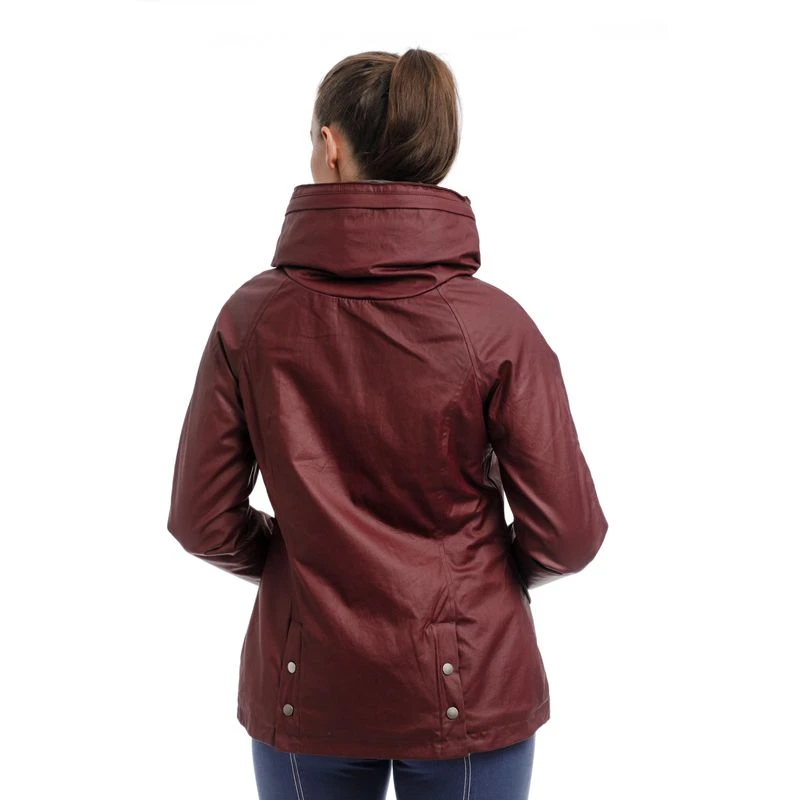 The Eliza Country Jacket is created in a waterproof, breathable fabric. It includes a fleece lining for extra warmth, along with a hidden hood, a two way front zipper with placket, zipped side comfort pockets, and back poppers for ease of equestrian use.