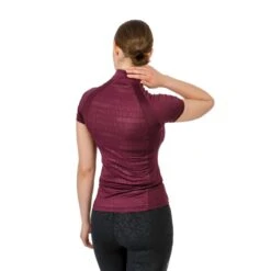 Features include short sleeves, trendy half zip placket, high neck color, and mesh insert details. 95% Cotton, 5% Spandex.