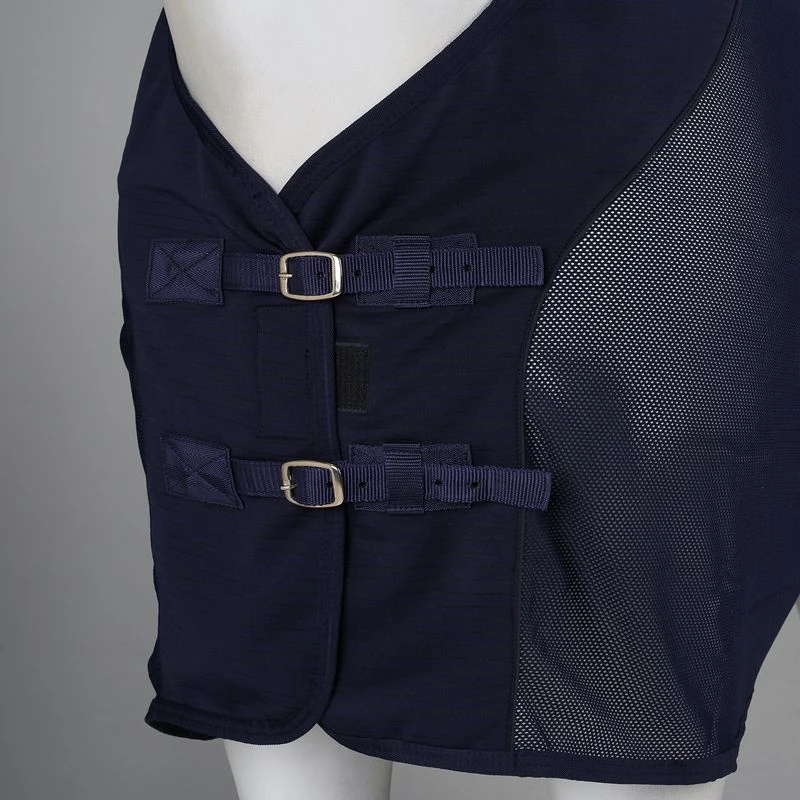 This rug is great for the summer. The mesh fabric keeps your horse cool while the knitted parts on the shoulders and neckline offer necessary warmth. This creates the perfect temperature. The two front buckles, X-surcingles and tailstrap guarantee a secure fastening, and prevent the rug from slipping.