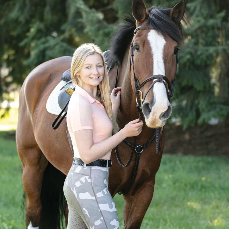 Feminine features include a keyhole opening at the upper back, a flattering tulip edge hem, traditional crisp collar, and mesh front raglan sleeve panels for ventilation.