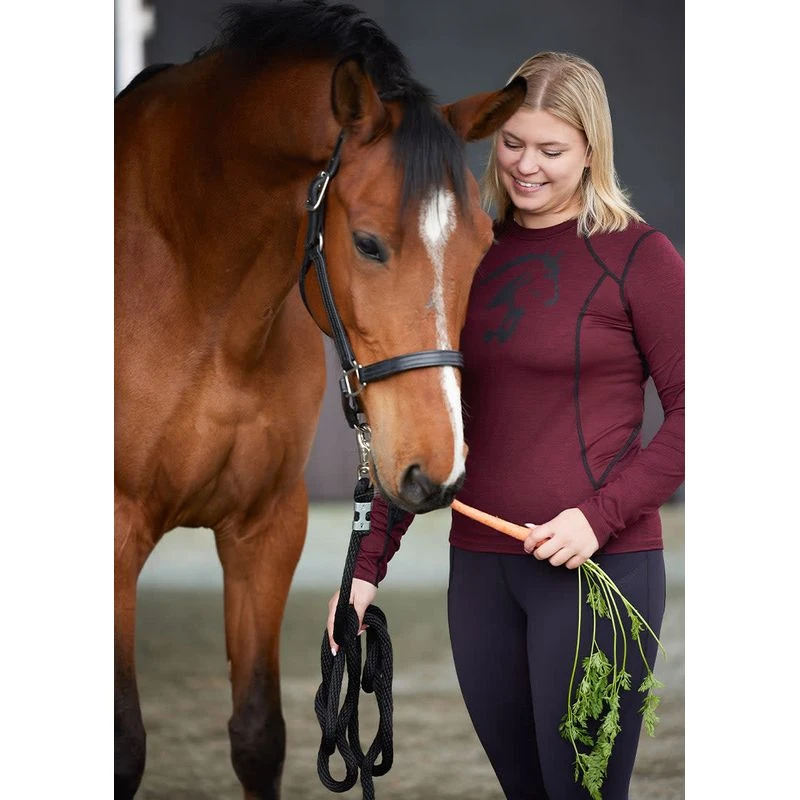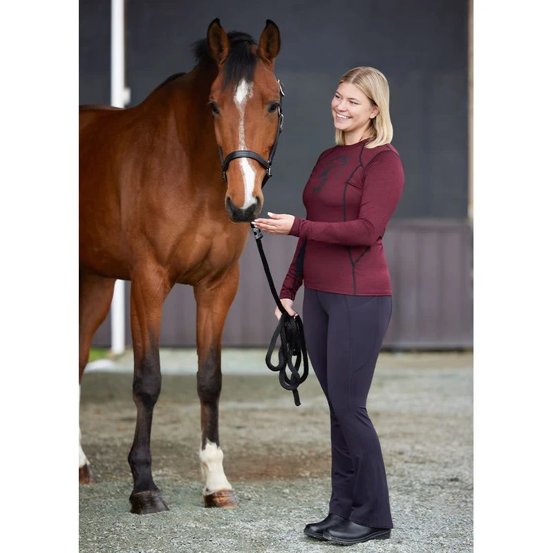 Kwikwarm technology stores heat to keep riders warm and keeps odors at bay permanently with anti-microbial properties. Coolpass panels placed in high sweat zones are moisture wicking and dry quickly. Made to layer with flat seams and a flattering, body-hugging fit.