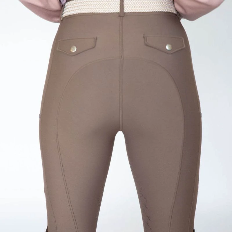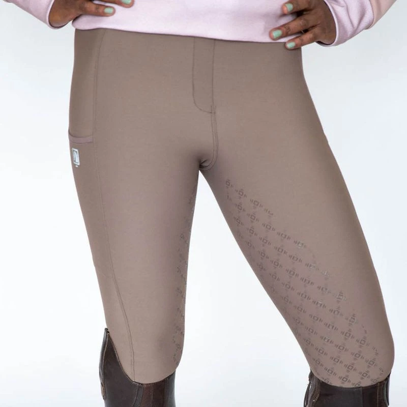 Features faux front fly, proper waistband with belt loops, keeping your belt from sliding up, and deep side pockets for phones and more. Subtle reflective silver logo prints. Elongated silicone knee grip in a quiet print, making both riders and trainers happy and great for keeping you in the saddle.