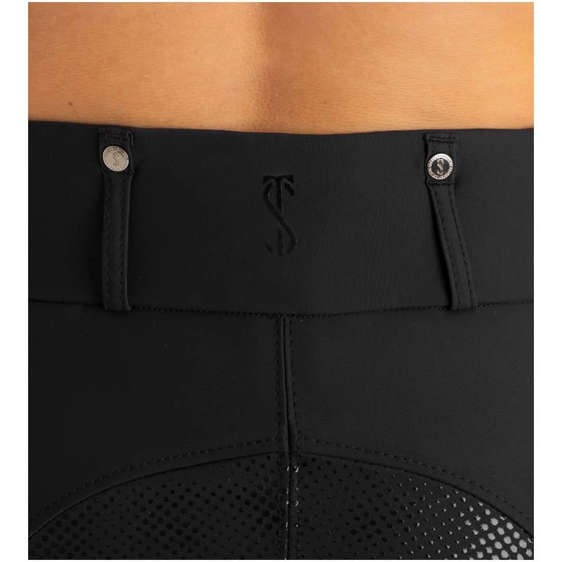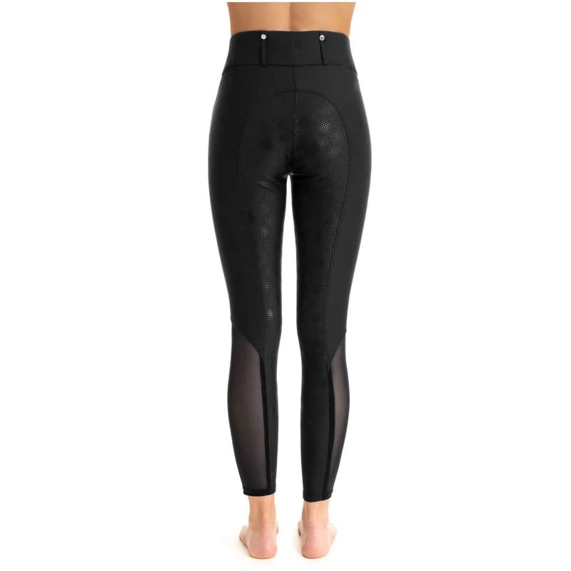 This is true compression fabric, powerful enough, yet also light weight, breathable and flexible. It reshapes your body, improves circulation, tightens and smooths skin and reduces the appearance of cellulite. These tights are super flattering, giving a slimmer look, The are moisture wicking to draw sweat away from the skin and embedded with an antibacterial, odor resistant application to minimize odor and bacterial growth. UPF50+ offers protection against the suns harmful rays. They look like breeches, not tights because of the curved front pockets, mock front zip and 3 branded buttons. The silicon is directly on fabric to create a full feat with perfect grip.