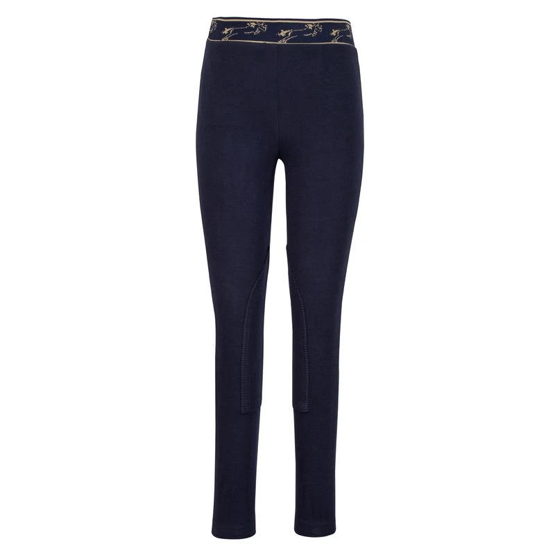 Made from soft cotton and spandex these schooling tights offer self-fabric knee patches an inside pocket and an elastic waistband featuring a jumping horse pattern. You will find the comfortable Cotton Schoolers to be the most affordable choice in riding tights.